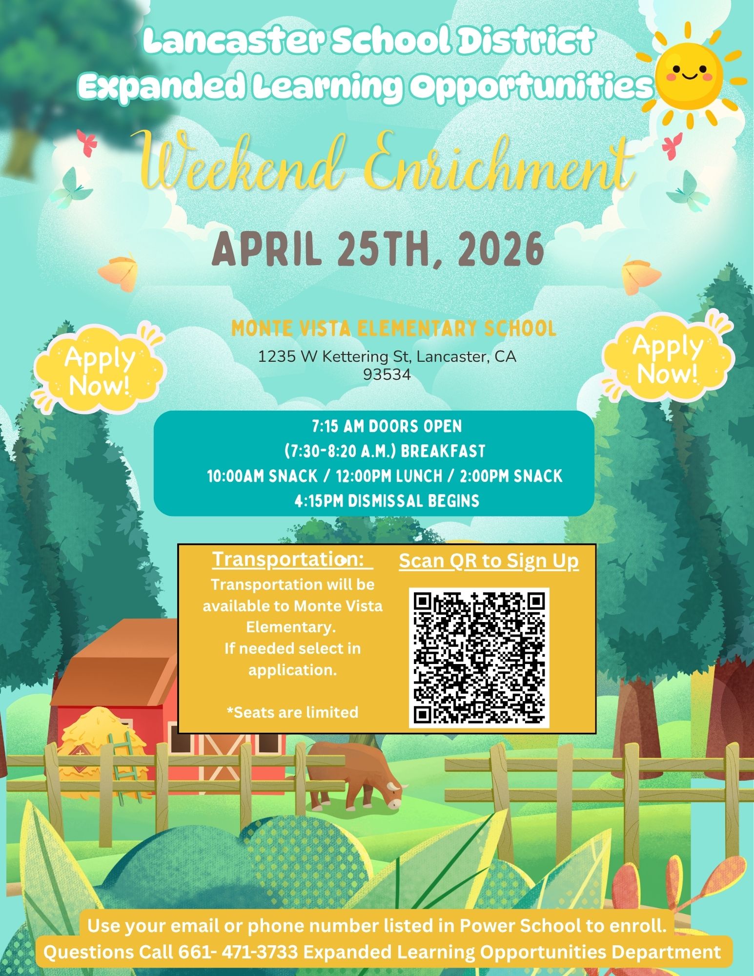 We’re excited to welcome LANCSD students to ELO’s Weekend Enrichment Program on Saturday, April 25, 2026 at Monte Vista Elementary!