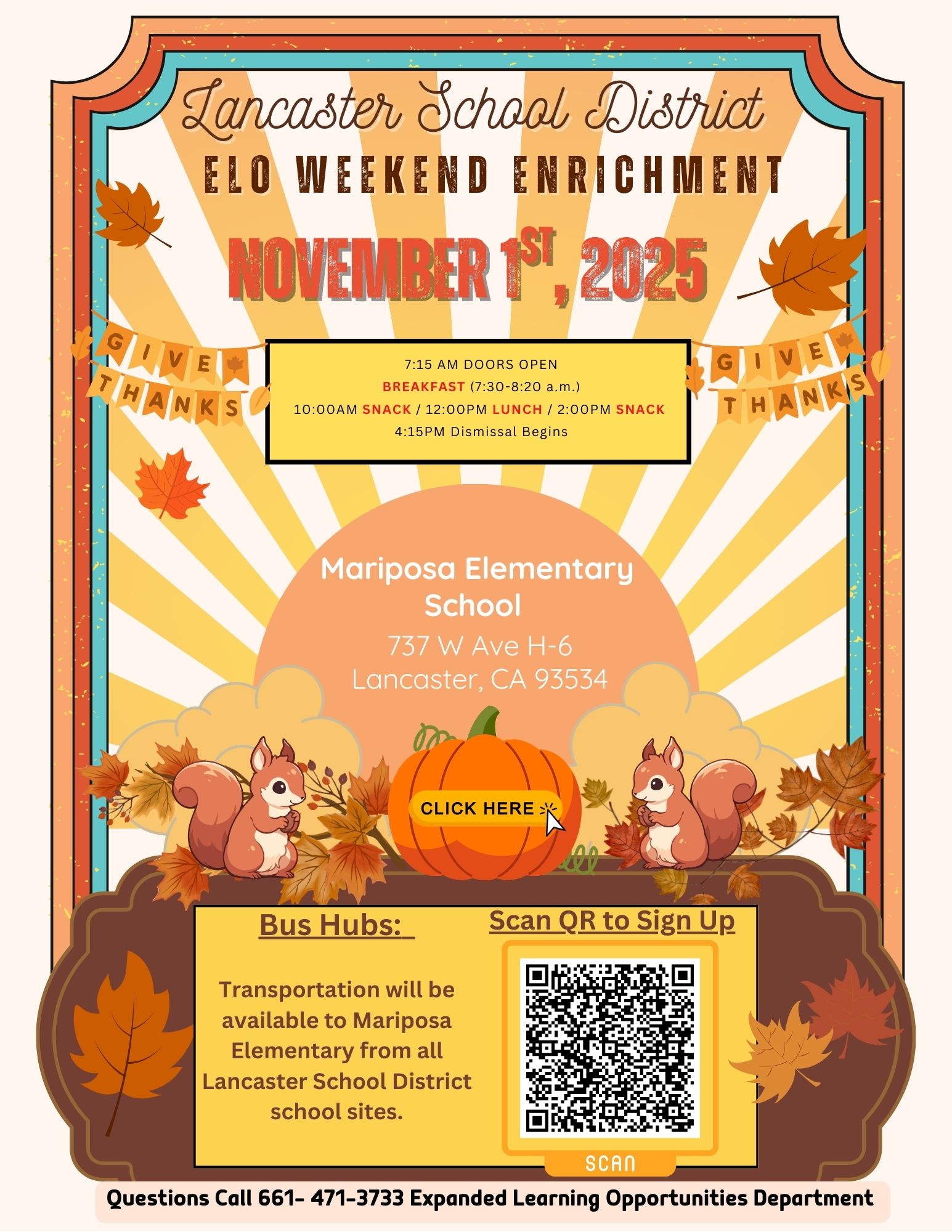 We’re excited to welcome LANCSD students to ELO’s Weekend Enrichment Program on Saturday, November 1, 2025 at Mariposa Elementary!