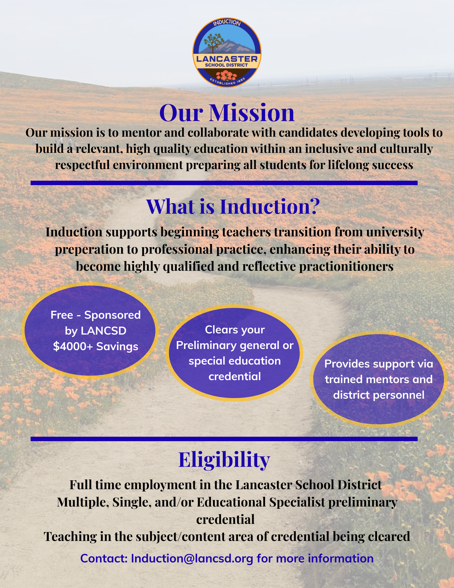 The Lancaster-Eastside Teacher Induction Program is a locally designed program that provides an essential bridge between teacher preparation and the attainment of a California Clear Credential. Grounded in the California Standards for the Teaching Profession (CSTP) and aligned with the California Commission on Teacher Credentialing Induction Standards, our program supports the growth and development of newly credentialed teachers while ensuring a pathway to professional licensure.